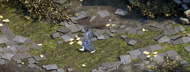 The spirit belongs to an Aedyran lord, who was one of the first colonists to arrive in the Dyrwood. Although the colonists burned the temple down in wake of the revolution, he continues to haunt the old stones in defiance of their defiance... Convinced that he is actually still alive, rather than utterly dead. This doesn't stop him from ardently worshiping Woedica, queen among the gods, the Oathbinder and Exiled Queen.