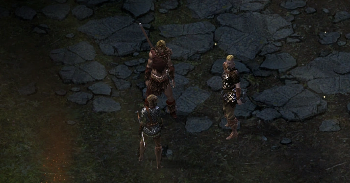 A lanky hunter grooms his stubble, a patched fuzz of blonde hairs, while listening attentively to a young elven woman. She whispers in his reddened ears and giggles. With his head still lowered, he flashes a wide smile in return.