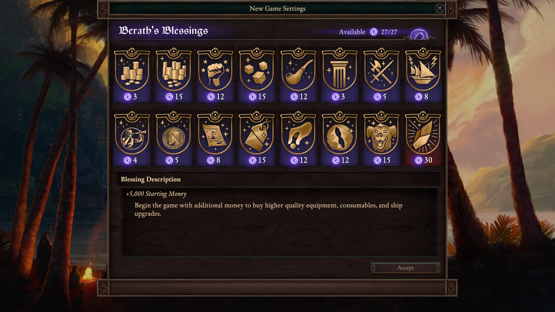 Berath's Blessings are optional upgrades you can select when starting a new game in Pillars of Eternity II: Deadfire. These are a set of additional options meant to change up the beginning of the game, generally by allowing the party to head to more challenging areas faster or reducing the need for exploration.