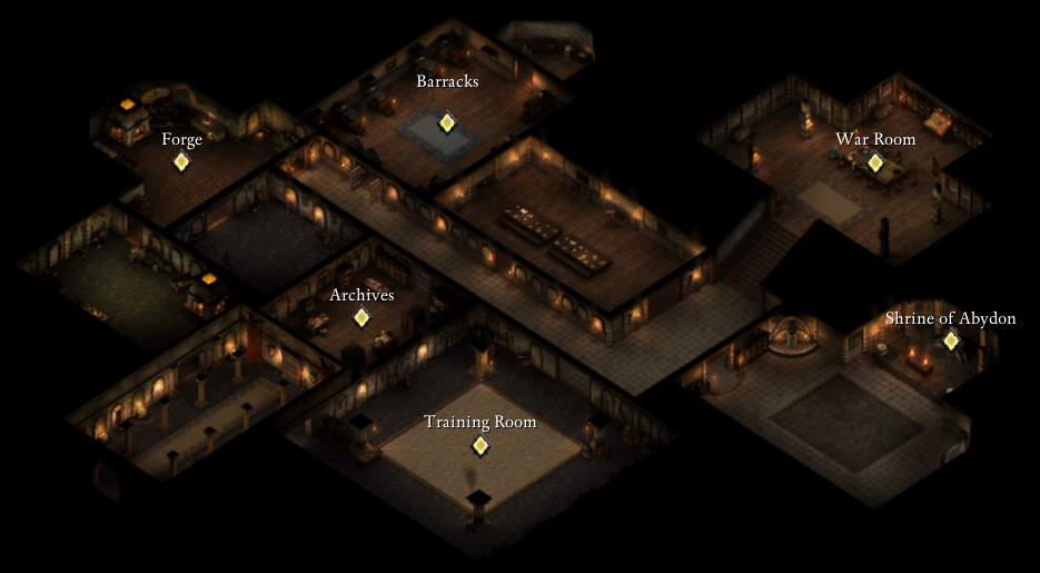 - The corridor bisects the keep, connecting the barracks, mess hall, shrine of Abydon, and terminating at the war room with commander Clyver looming over the situation map.