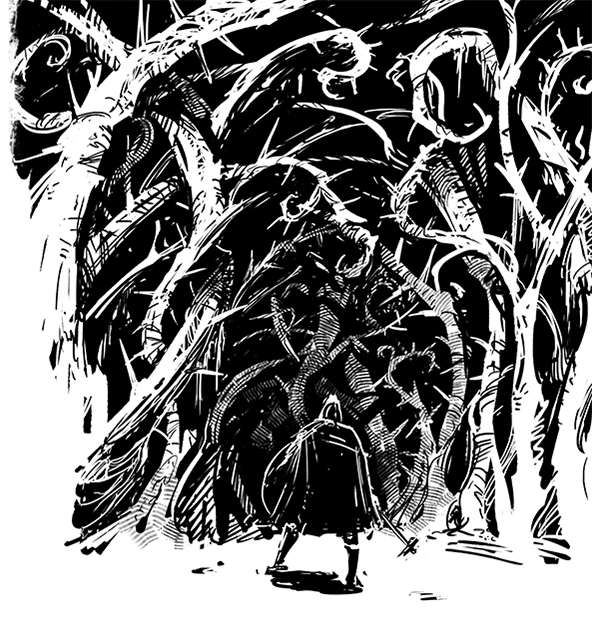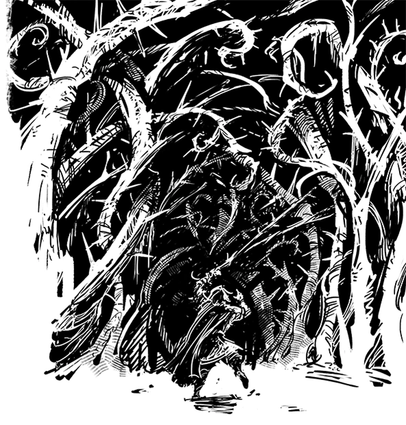- You can avoid the enemies in the north part of the area by pushing through the thorns in the south-east, though you will not be able to return the same way without looping around - it's a one-time crossing. Crossing unscathed requires at least Survival 5 on all party members, otherwise the character with the lowest Survival gets a Concussion (-2 Intellect, -2 Resolve).