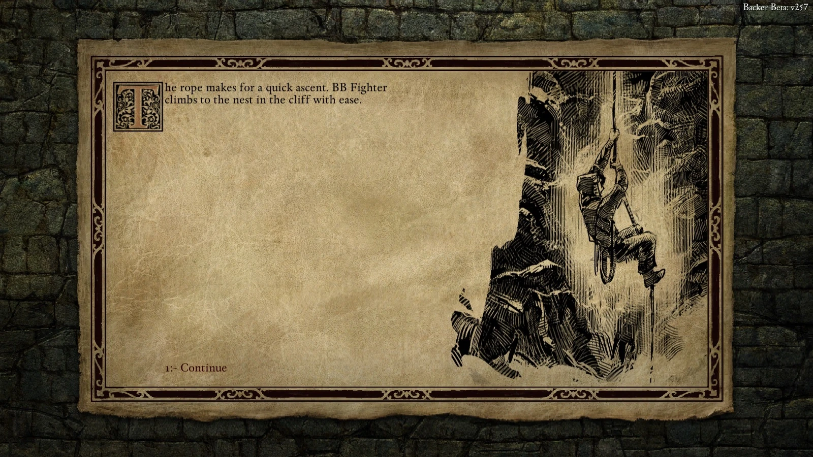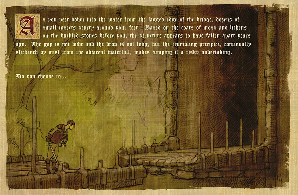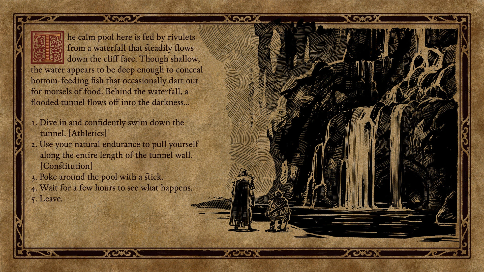 Scripted interactions are story sequences told through the use of on-screen text descriptions, illustrations, and sounds. They are used to emphasize events, and offer different choices to solve an event outside the typical realms of combat and person-to-person dialogue. The options often require character attribute and skill checks e.g. Physical options like lifting something with a strength stat or stealing with dexterity. [1][2][3] These checks are sometimes for the character interacting with the scene, and other times for the whole party. Characters can become injured, or in some cases killed by being below the threshold of an attribute or skill check in a scripted interaction. [3]