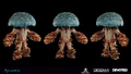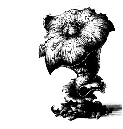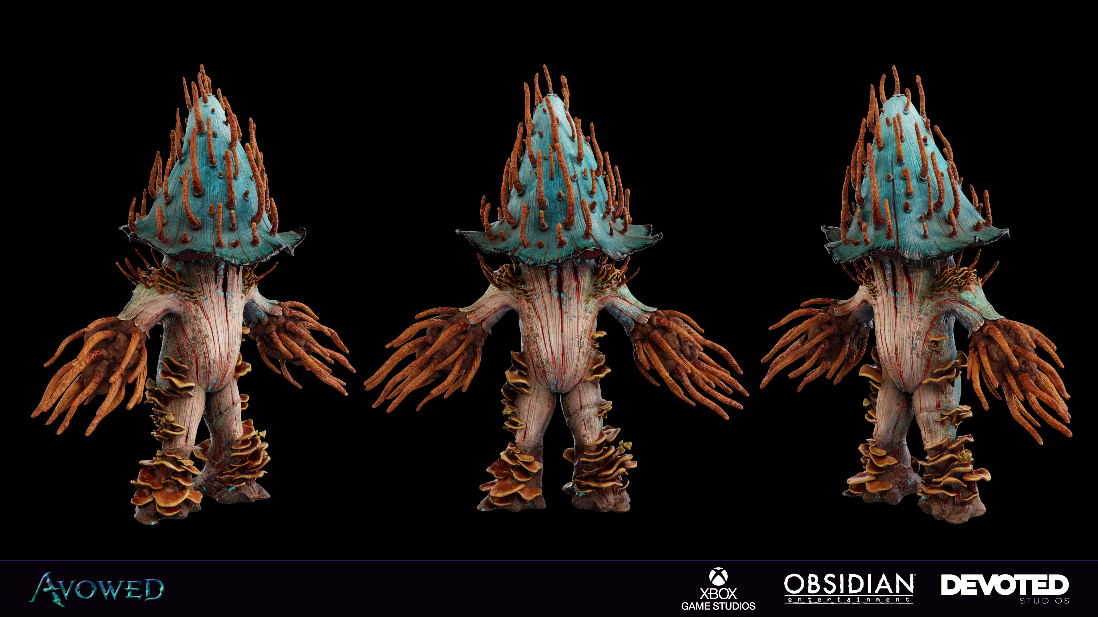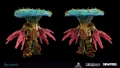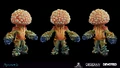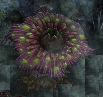 These giant mushrooms stand nearly as tall as adult aumaua, and are topped by a broad and colorful cap. Their enormous weight is only held upright by the dozens of roots surrounding their base. Grown up Spores are unique, compared to their larva form of fungi, in their appetite for the souls of living creatures. They often grow and move in groups along the forest floor, searching for weakened or exhausted travelers who are unable to fight back. Once they find a host, they bind to it and supply it with the basic nutrients required to keep it alive while they absorb its essence. Spores are extremely hostile once they find a host, and will attack anything that gets close to their meal with their poisonous, barbed roots.