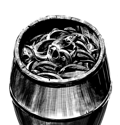 The barrel of fish Zahua is hiding in when first encountered by the Watcher